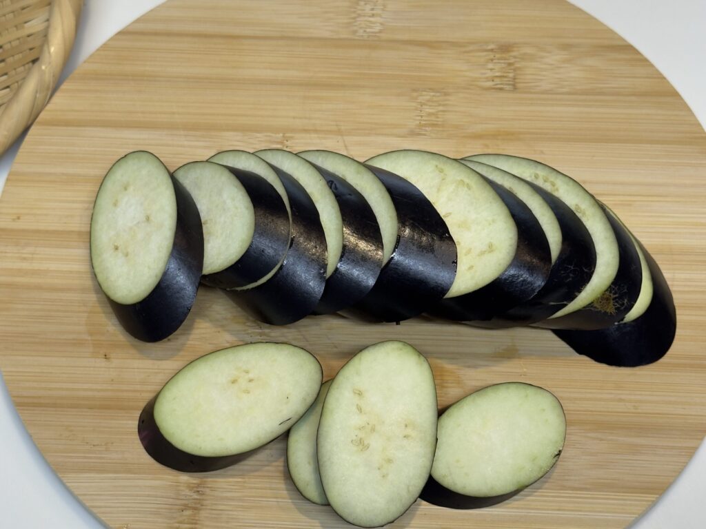 ②油を入れ、中火にかけ、カリカリになるまで揚げ焼きをし取り出し、その油でナスを焼く。