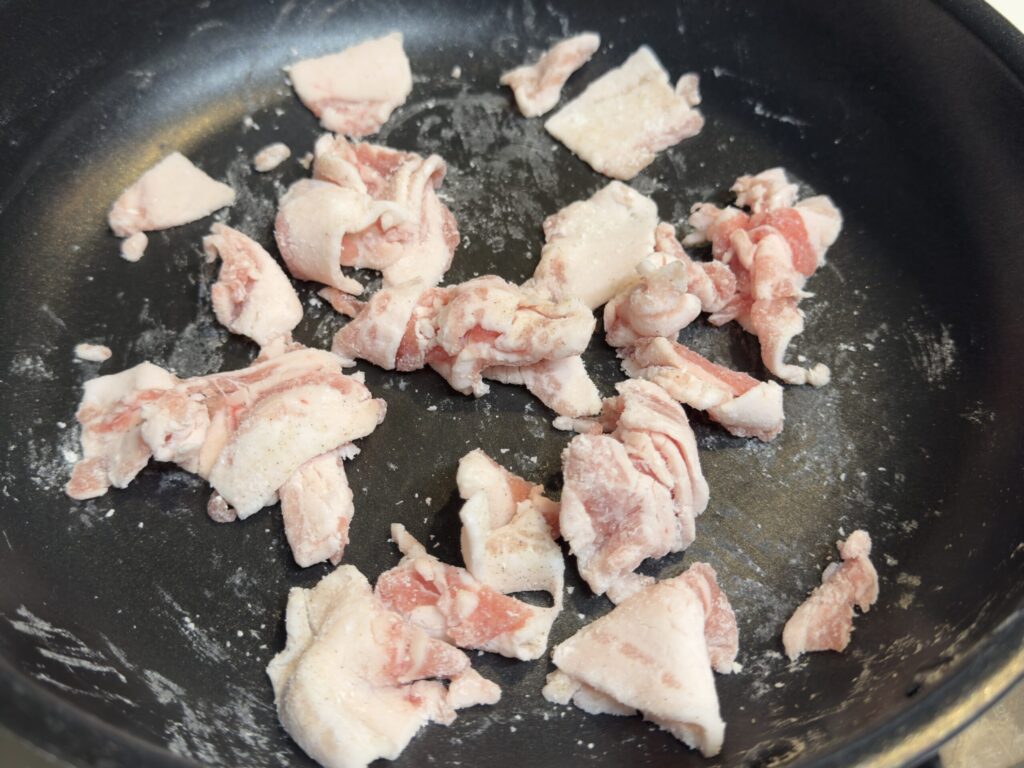 ①ナスは1センチ幅に切り、大葉は千切りにする。豚バラ薄切りをキッチンバサミで一口サイズにきりフライパンに入れ、塩コショウをし片栗粉を塗す。